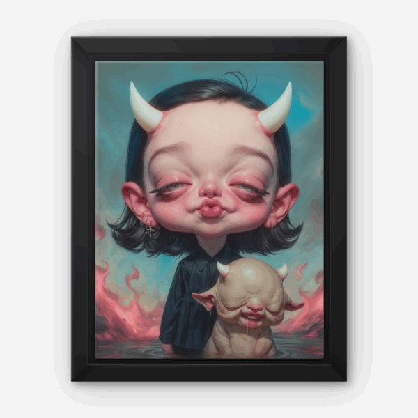 The work features a horned figure with a quiet, self-assured expression standing beside a small, creature-like companion, both emerging from a surreal fiery backdrop. The piece captures a tension between chaos and calm, fragility and defiance — hallmarks of Shannon Bulrice’s pop surrealist practice.